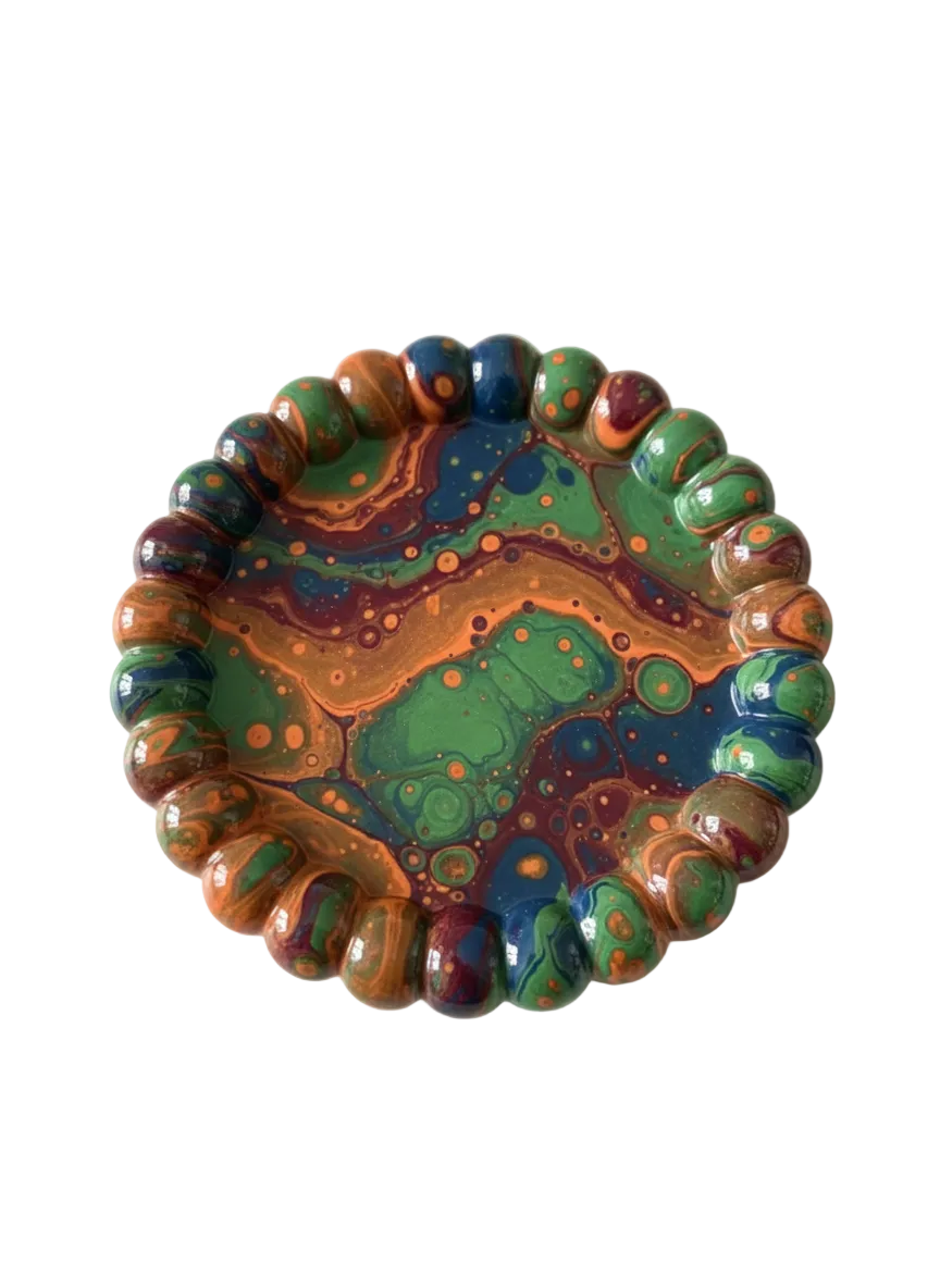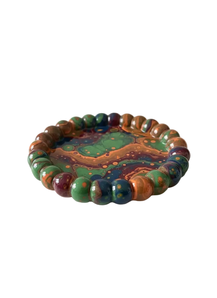 Takılarınızı sadece saklamakla kalmayın, onları birer sanat eseri gibi sergileyin! Tamamen el emeğiyle hazırlanan bu özel yüzük tabağı, doğadan ilham alan alacalı yeşil tonları ve özgün formuyla şifonyerinize veya banyonuza zarafet katacak.