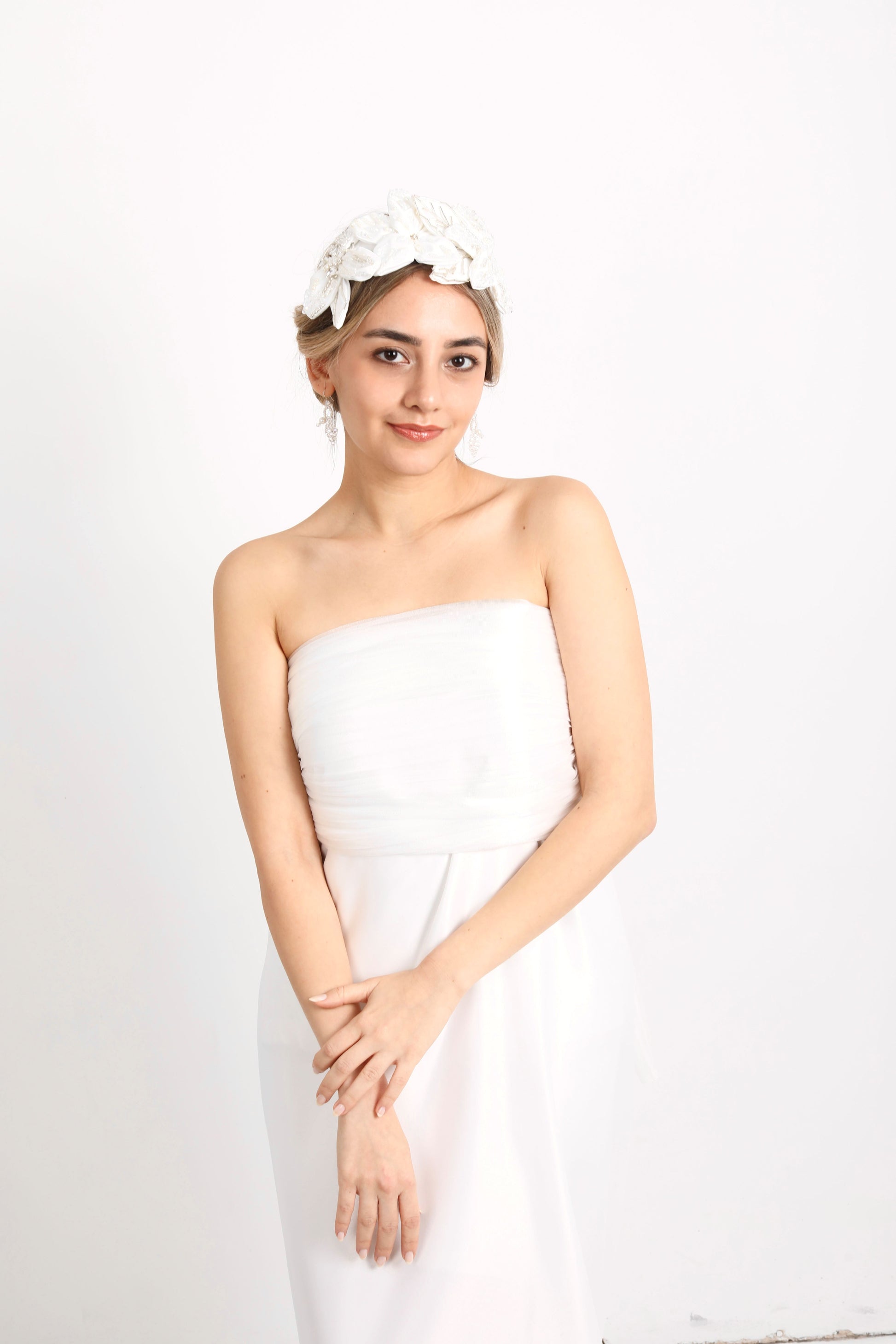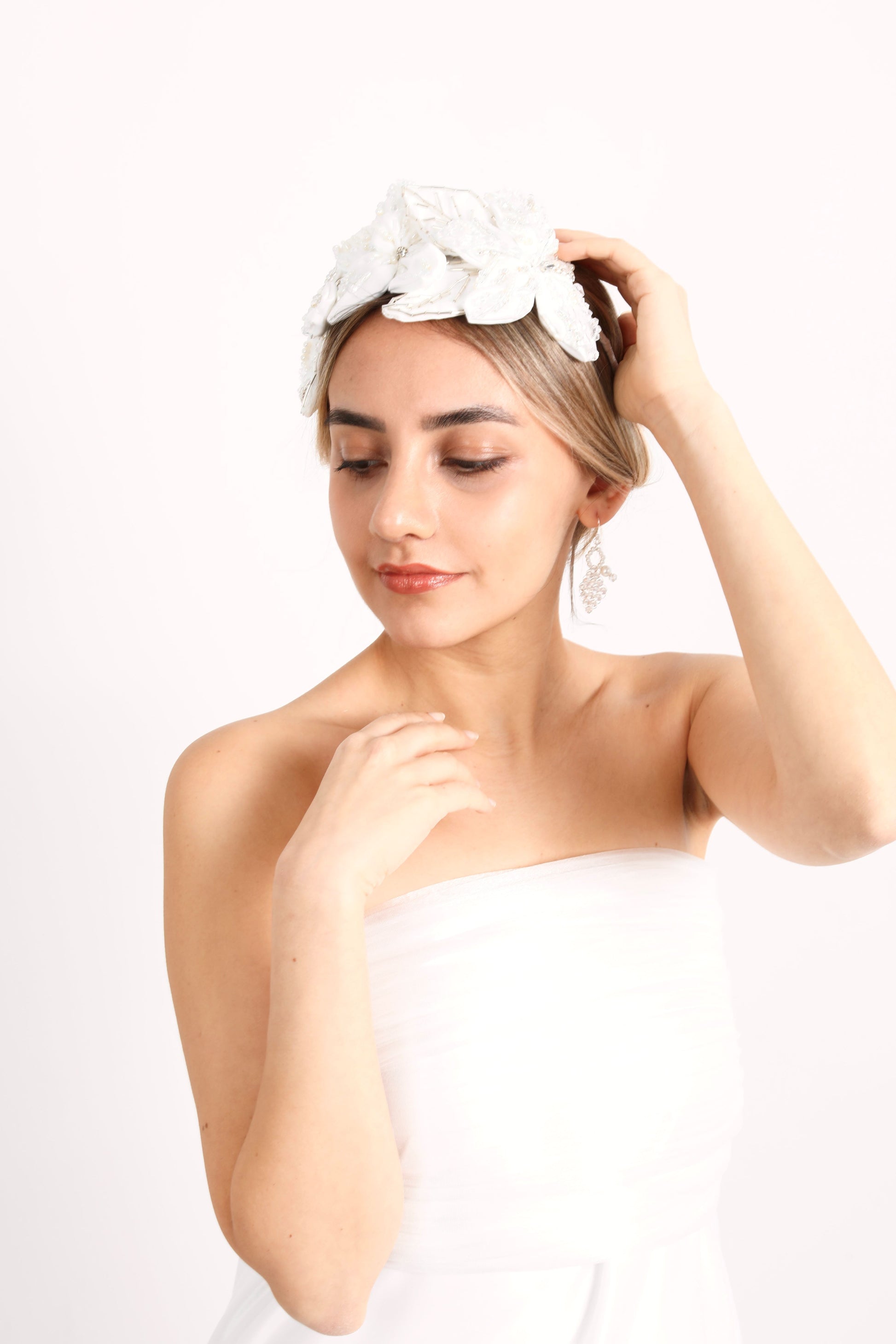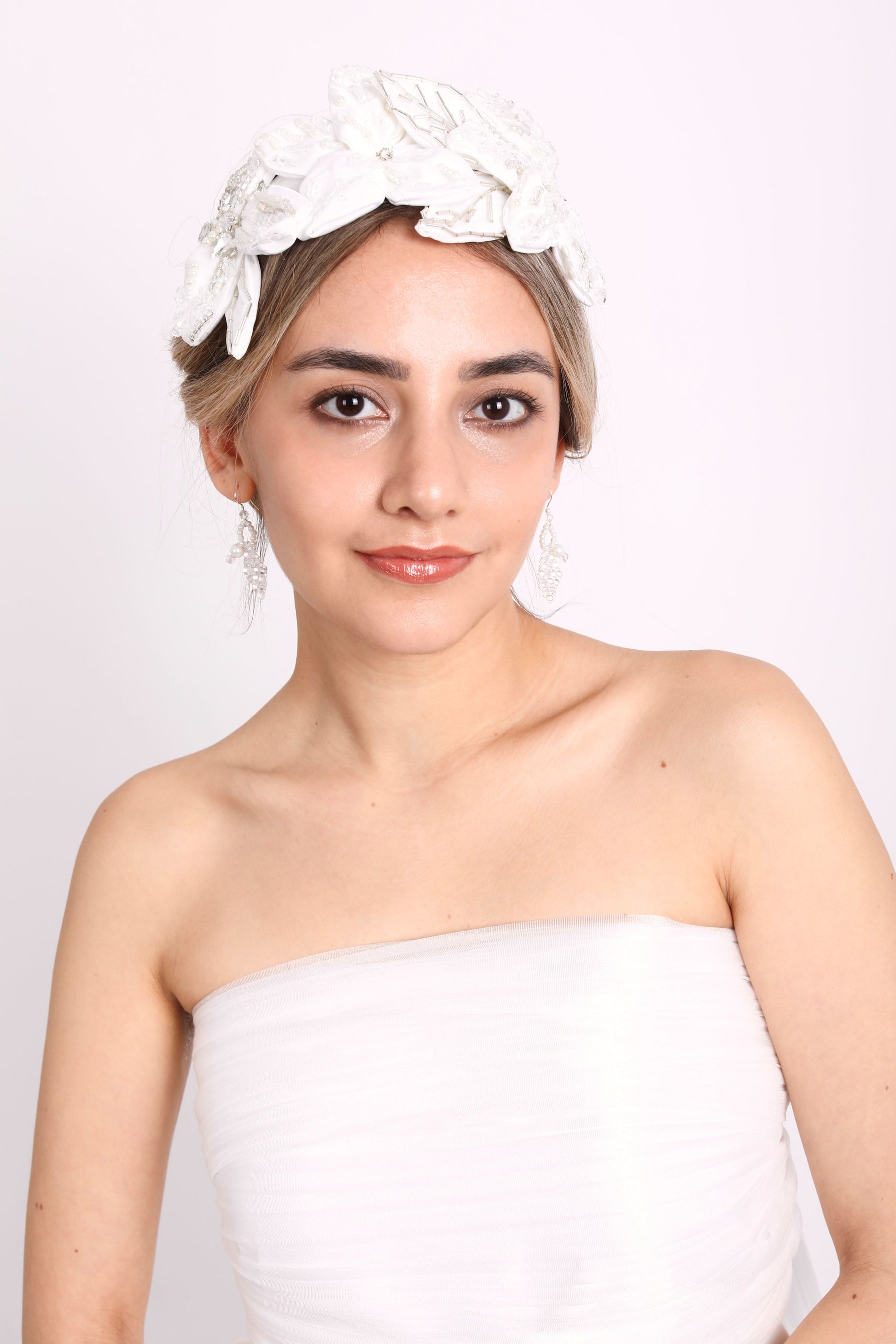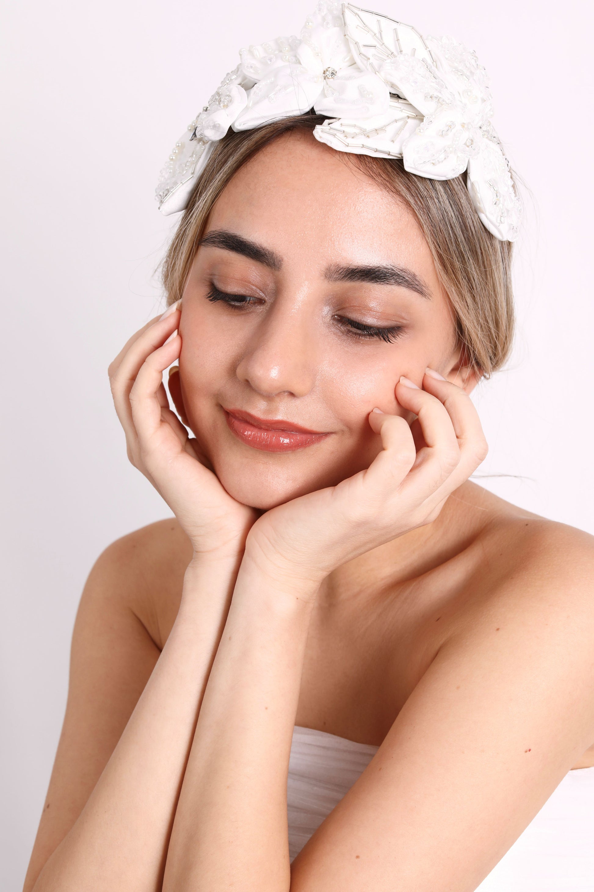 - İpek saten çiçekler üzeri, kristal, inciler, kristal taşlar ve boncuklar işlenmiştir.